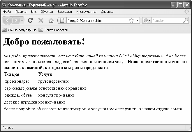 Сохраним программный код в файле под названием Компания.html, и откроем его в окне Интернет-обозревателя. Результат выполненных действий показан на рис. 2.15.