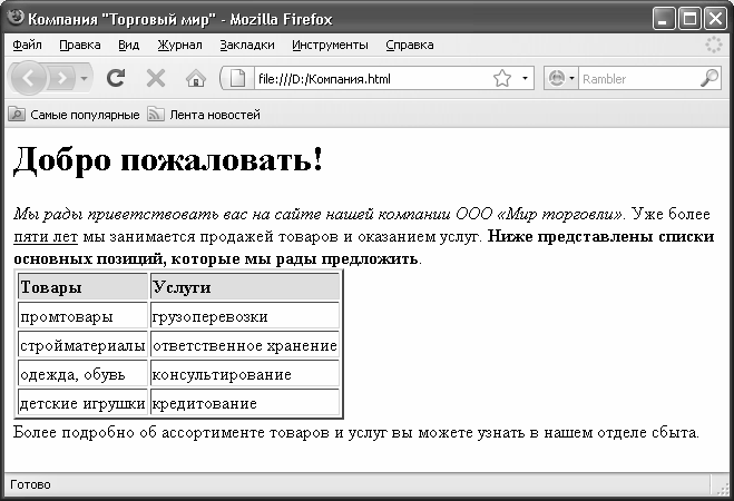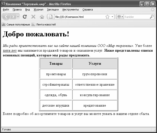 Представление данных в табличном видеВ рассматриваемом примере мы оформим в виде таблицы перечни товаров и услуг. Для этого изменим программный код таким образом, чтобы они отображались не в виде маркированного и нумерованного списков, а в виде одной таблицы.