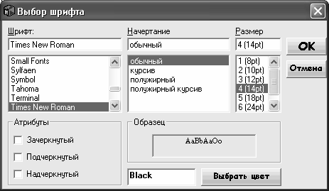 С помощью кнопки Шрифтосуществляется переход в режим настройки параметров шрифта. При нажатии данной кнопки на экране отображается окно, которое показано на рис. 3.5.