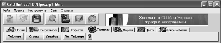 В программе CatsHtml реализована возможность автоматического формирования таблиц. Для этого предназначены инструменты, находящиеся на вкладке Таблица. Содержимое данной вкладки представлено на рис. 3.7.