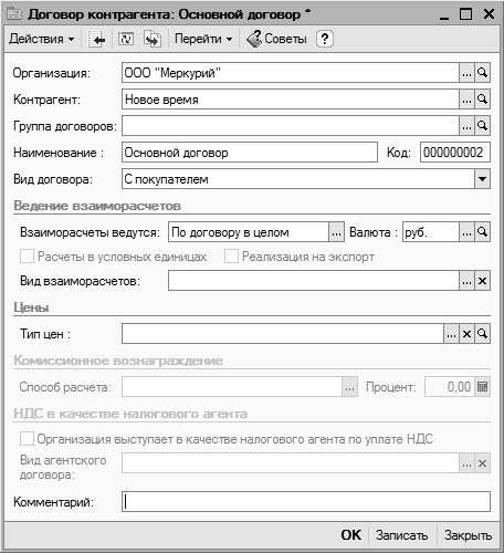 Рис. 2.19. Ввод информации о договоре с контрагентом
