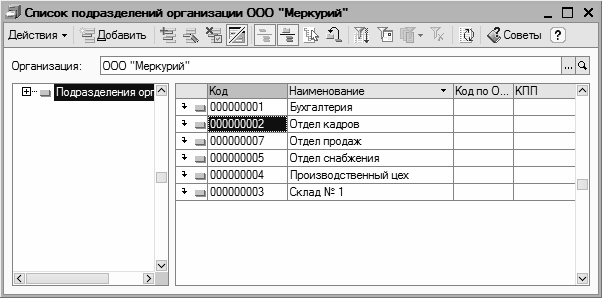 Чтобы войти в режим работы со справочником подразделений, его можно выбрать в окне выбора справочников (см. рис. 1.13), либо открыть с помощью команды главного меню Предприятие | Подразделения организаций. При выполнении любого из указанных действий на экране отобразится окно справочника (рис. 2.21), которое имеет иерархическую структуру: слева формируется список групп подразделений, а справа отображается содержимое группы, выделенной курсором.
