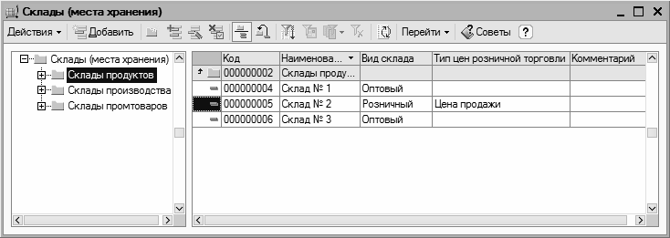 В крайней слева колонке списка отображается символ текущей записи в зависимости от наличия у нее подчиненных уровней. В последующих колонках отображаются код текущей записи, ее наименование, вид склада, тип цен розничной торговли и при необходимости – произвольный комментарий.