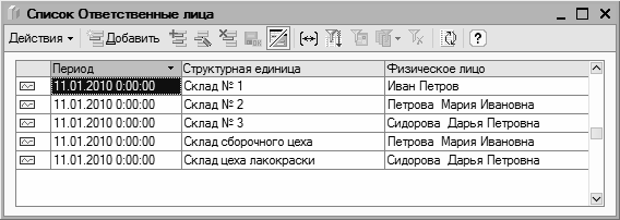 Для каждой позиции списка в соответствующих колонках отображается дата назначения ответственного лица, наименование структурного подразделения предприятия (здесь могут быть не только склады, но и, например, кассы), а также ФИО ответственного лица.