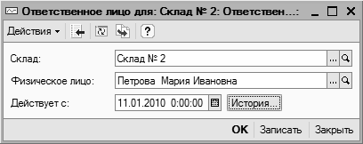В поле Действует с указывается дата назначения данного лица ответственным по складу. Завершается ввод сведений нажатием кнопки ОК или Записать. Кнопка Закрыть предназначена для выхода из данного режима без сохранения выполненных изменений.