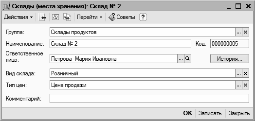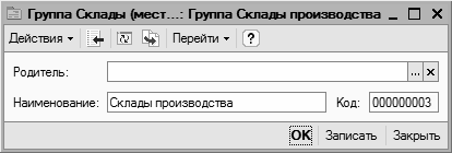 Этот справочник имеет иерархическое представление. Однотипные складские помещения целесообразно объединять в группы (например, группа Производственные склады, группа Склады промтоваров и т. п.).