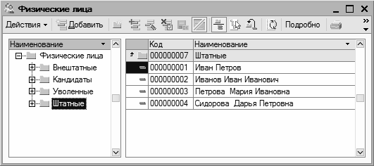 Окно справочника состоит из двух панелей. В левой части формируется перечень групп физических лиц (Штатные, Внештатные, Уволенные и др.), а в правой части отображается содержимое группы, на которой установлен курсор.
