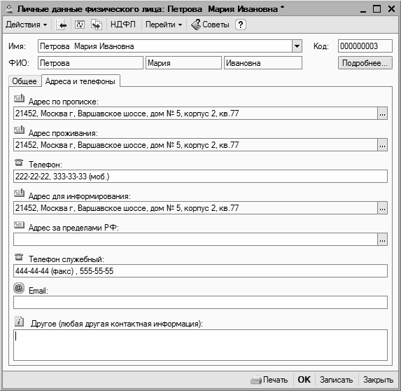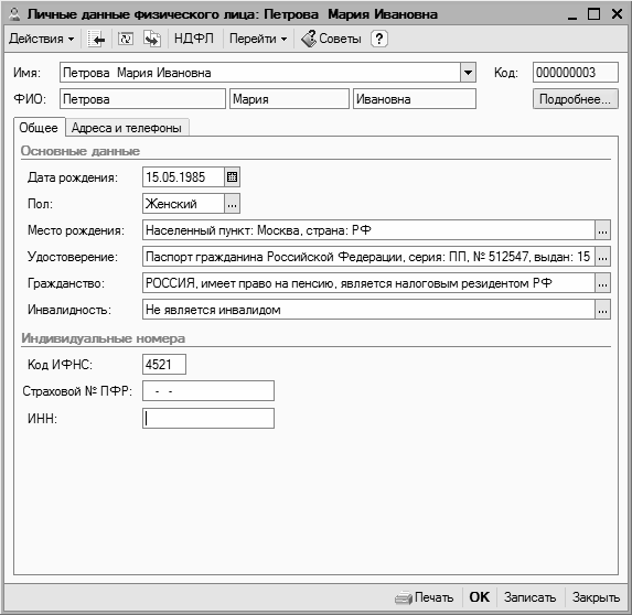 Завершается ввод данных о физическом лице нажатием кнопки ОК или Записать. В первом случае данные будут сохранены одновременно с закрытием окна ввода/редактирования, во втором – окно закрыто не будет, но данные сохранятся.
