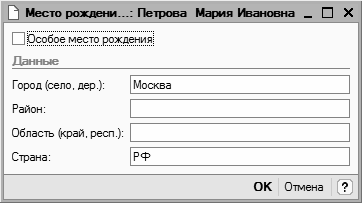 В этом окне нужно с клавиатуры ввести соответствующие данные (все параметры заполнять необязательно) и нажать кнопку ОК. На рис. 2.30 значение поля Место рождения сформировано в соответствии со значениями параметров, показанными на рис. 2.31.