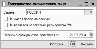 Если по каким-то причинам человек не имеет права на пенсионное обеспечение либо не является налоговым резидентом Российской Федерации, то нужно установить соответствующие флажки. В отдельном поле указывается дата, начиная с которой запись о гражданстве считается действительной. С помощью кнопки История можно просмотреть историю изменений записей о гражданстве данного физического лица.