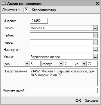 На рис. 2.34 значение поля Адрес по прописке сформировано в соответствии со значениями параметров, показанными на рис. 2.35.