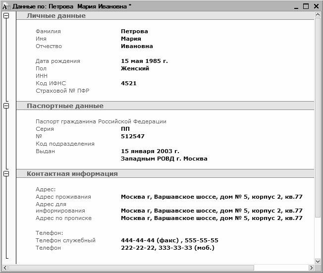 При необходимости данные о физическом лице можно вывести на печать. Для этого нужно нажать кнопку Печать, которая находится внизу окна слева от кнопки ОК. Пример печатной формы документа показан на рис. 2.36.