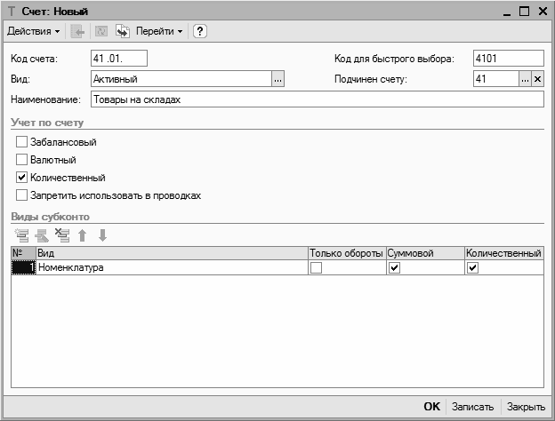 • признак ведения количественного учета. Обычно этот признак устанавливается счетам, по которым ведется учет в натуральных показателях (например – счета по учету товарно-материальных ценностей);