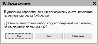Здесь путем установки соответствующих флажков можно выбрать позиции, которые будут занесены в список корректных корреспонденций. Если установлены все флажки, то на каждый субсчет будет сформирована отдельная запись в регистре корректных корреспонденций. Если снять все флажки, то в регистр не добавится ни одна запись. А чтобы в него попала запись только с родительским счетом, нужно нажать кнопку Нет при появлении запроса (см. рис. 3.6).