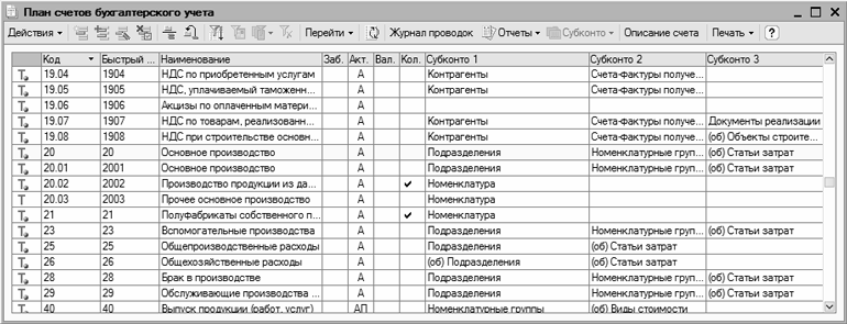 В окне содержится перечень счетов бухгалтерского учета. Для каждой позиции списка в соответствующих колонках показывается следующая информация: