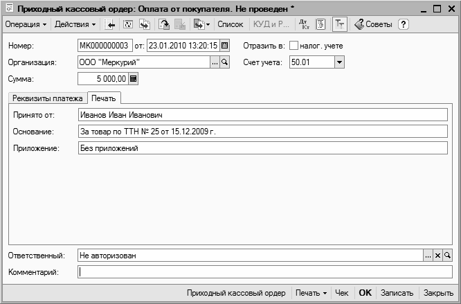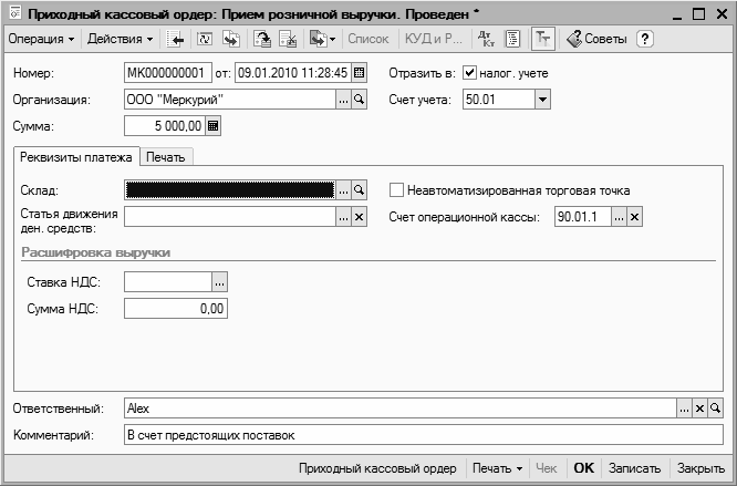 Рис. 4.6. Приходный кассовый ордер для операции Прием розничной выручки