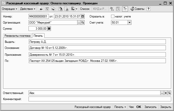 Рис. 4.11. Редактирование расходного кассового ордера, вкладка Печать
