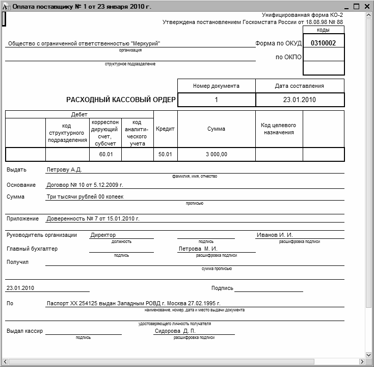 Рис. 4.12. Печатная форма расходного кассового ордера