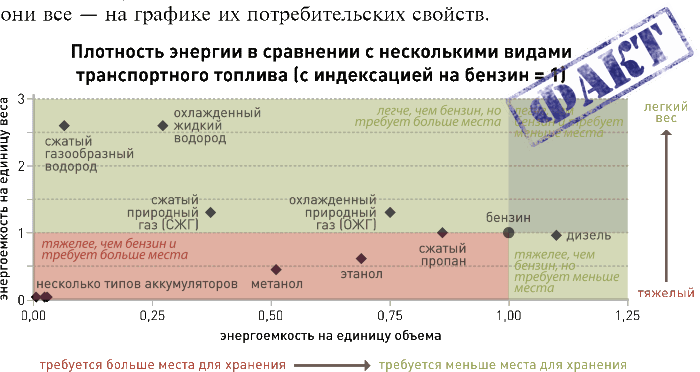 В общем, совсем не удивительно, что человечество так плотно подсело на бензин и дизель, которые получают переработкой сырой нефти, топливо – это оптимально с точки зрения плотности энергии на единицу массы и объема. Все другие варианты либо тяжелее, либо занимают больше места. Некоторые альтернативы умудряются совместить в себе обе отрицательные характеристики: одного взгляда на электрические батареи на графике достаточно, чтобы безошибочно предсказать судьбу автономного электротранспорта. Кроме того, картинка наглядно демонстрирует, что количество альтернатив ограничено и выбирать топливо будущего мы будем из метанола, этанола, пропана, сжатого природного газа и сжиженного природного газа.