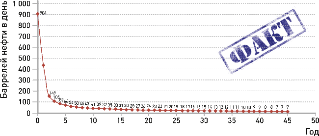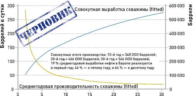 Как видите, резво начав с 500 баррелей в день (а если повезло, то и с 900!), скважина на Баккене уже через год вполне может выдавать лишь 150 баррелей нефти в сутки, а через пять лет – 60 бочек. В результате анализа этой фактической деятельности стало возможным построить прогноз: одна продуктивная скважина формации Баккен в 30-летнем пределе может выдать около 550 000 баррелей сырой нефти.