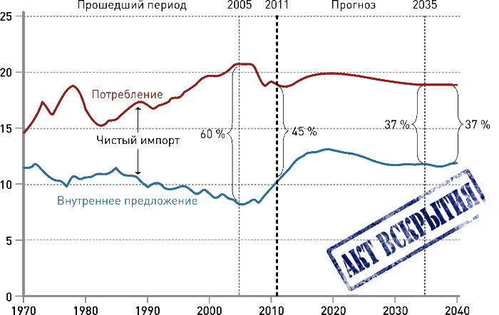 Как видите, США к 2035 году на 63 % независимы по нефти. Ну и, соответственно, на 37 % – зависимы. Помните, как в старом анекдоте: «Штирлиц оказался при этом чуть-чуть разоблачен, а радистка оказалась немножко беременна».