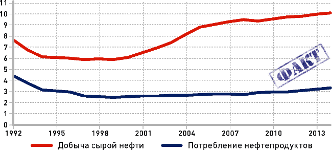 Рис. 66. График потребления и добычи нефти в России. Данные EIA.