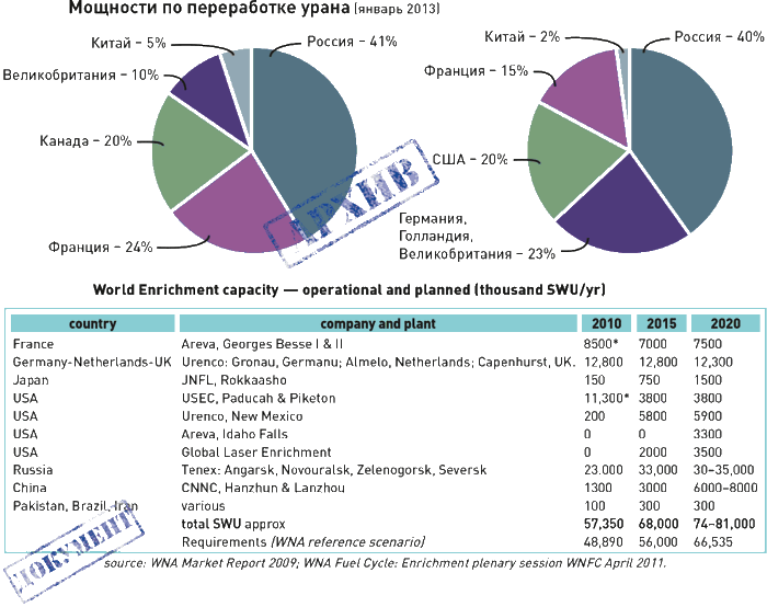 Все остальные обогатители мира, включая и Японию с ее мощной ядерной энергетикой, имеют не более 3 % от мировых мощностей по обогащению. На ядрен-батон, может быть, им и хватит, а вот на создание своего замкнутого ЯТЦ уже нет. И Япония или Южная Корея для своих АЭС вынуждены покупать готовое урановое топливо за рубежом, например во Франции или США.