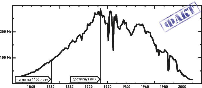 Надо сказать, что иллюзии 1861 года никак не отличались от иллюзий года 2013-го. В 1861 году произошло много исторических событий. В Российской империи было отменено крепостное право. Между североамериканскими штатами началась гражданская война. А в Англии был построен первый в мире стальной броненосец с паровой машиной, гребным винтом и композитной броней. Век железа, угля и пара был в разгаре, но остался забытым данный в том году ответ на волновавший английскую публику вопрос: «На сколько времени хватит наших угольных копей?». Ответить на этот вопрос попытался геолог Эдвард Хулл. Подсчитав известные запасы угля, он написал в своей работе «The Coal-Fields of Great Britain» следующее: «доступное количество угля составляет 89 424 миллиона тонн, чего хватит не менее чем на 1100 лет». Всего 150 лет спустя, в 2011 году, годовая добыча угля в Британии снизилась до уровня 18,3 миллиона тонн – всего лишь до уровня в 6,3 % от пика годовой добычи в 292 миллиона тонн, которого Великобритания достигла уже в 1913 году. Случилось это всего через 52 года после прогноза Хулла, который пророчил углю еще 1500 лет жизни. А годом позже «пика угля», в августе 1914 года, 40 % британских шахтеров призывного возраста отправились добровольцами в кровавую мясорубку Первой мировой. Но это лишь совпадение, точнее – «теньденция», как говорил чукча из анекдота, наблюдая за пятым оленем, который тоже сорвался вниз с крутого обрыва. Тот, угольный гегемон так закончил свой век. И такая «теньденция» у нас всегда у гегемона, находящегося на пике.