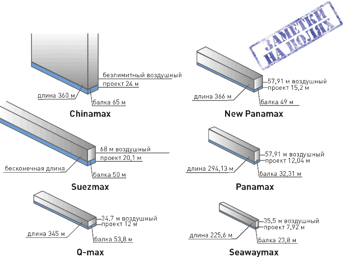 И именно по этим причинам для сообщения через Панамский канал был исторически придуман размер судна, называемый Panamax, через Суэцкий канал ходят суда типа Suez-Max, а во внутренние моря Евразии могут заходить, в основном, только суда типа Aframax – большинство портов во внутренних морях не рассчитаны на сверхбольшие осадки гигантов типа ULCC и VLCC.