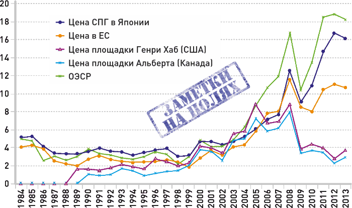 Рис. 165. График колебания цен на газ на мировом рынке в период 1984–2013 гг.