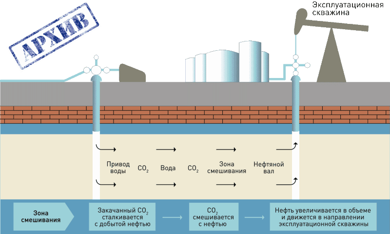 Легче всего выдавить нефть, подавая в водонапорные скважины углекислый газ. Углекислый газ растворяется в нефти, содержащейся в породе, и собирает ее в более крупные «капли», которые уже можно выдавить вместе с потоком воды в добывающий ствол.