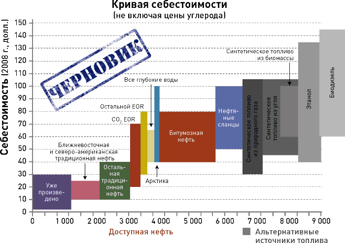Как видно из графика, вся уже добытая традиционная нефть легко уложилась в пределе себестоимости от 2 до 30 долларов за баррель.