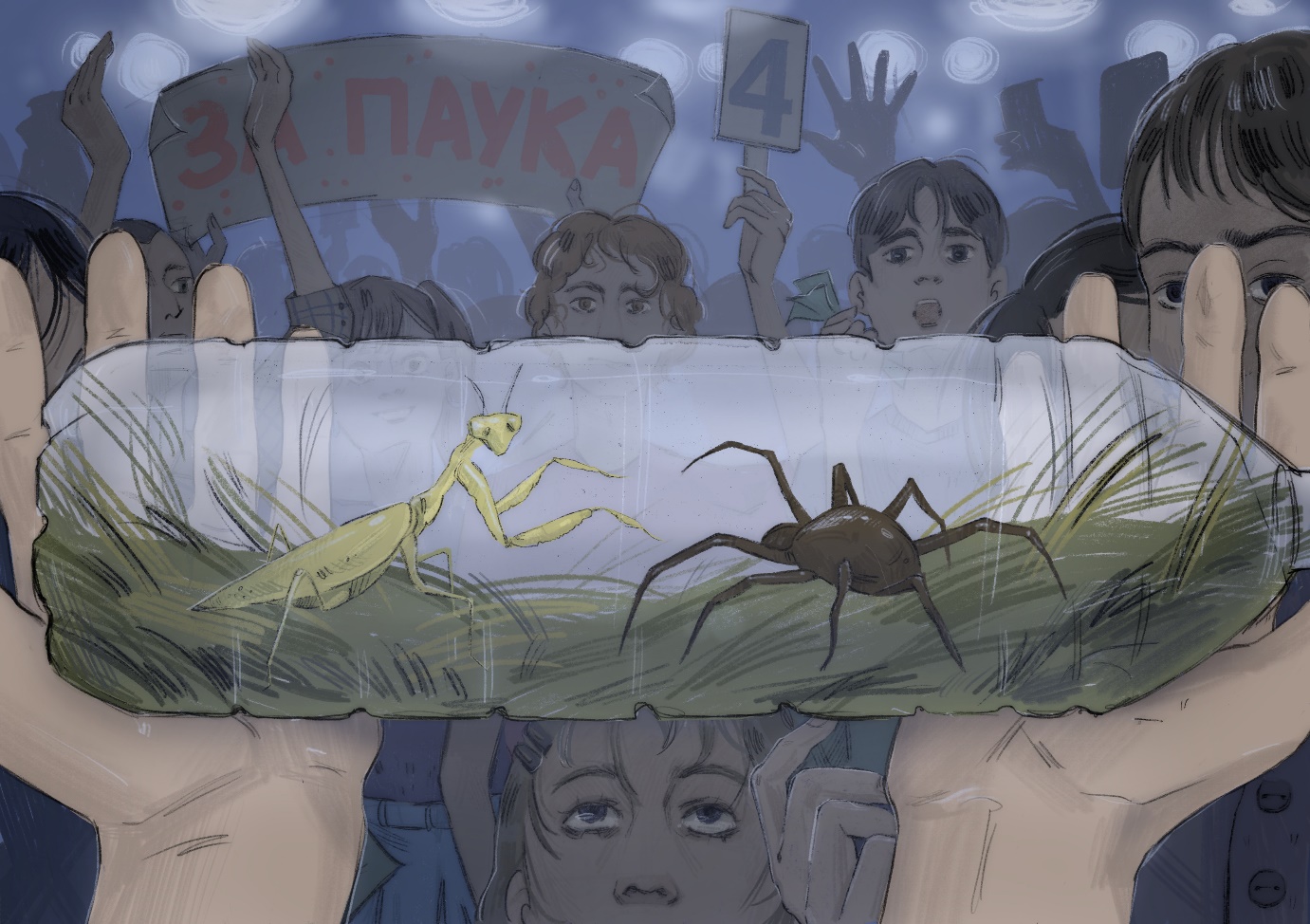 Теперь расскажу про легендарные бои насекомых. Во время работы на поле или в перерыв, когда сильно светило солнце, мы находили для себя развлечение: ловили какого-нибудь жука, сажали в пустую 1,5-литровую бутылку, оставалось только найти такого же соперника со своим боевым питомцем, и тут начинался файт. В начале нужно было как следует встряхнуть в полторахе насекомых, после чего они начинали яростно драться между собой. Участники могли быть вообще разные: два маленьких против одного большого, какие-нибудь кузнечики один на один, жуки, пауки, гусеницы и другие самые разные бойцы. Мы постоянно их тренировали, эти гладиаторы сражались за свободу – была особая иерархия, чемпионы, лидеры. На бои мы делали реальные ставки, как правило, сиги и мелочь, либо наказание в виде приседаний. В списке самых популярных и заветных выигрышей обычно значились конфеты и печенье. Накуренным наблюдать за этим было особенно интересно.