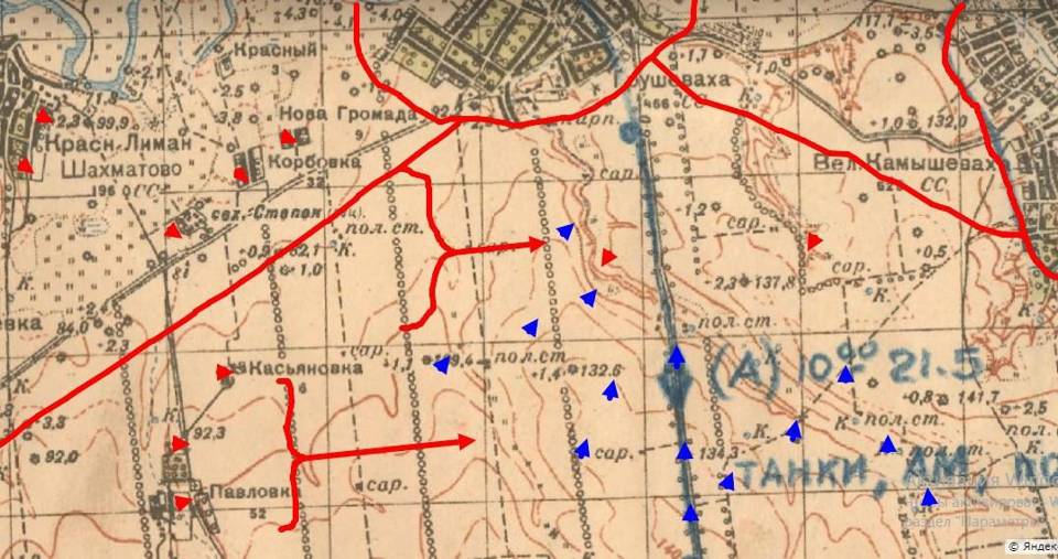 Практически одновременно взревела почти сотня двигателей, и танковые батальоны бригад устремились в контратаку. Из населённых пунктов Корбовка и Красный Лиман танкисты 57-й бригады, а из деревень Павловка и Касьяновка 131-й бригады. Домиков и сараев в деревушках сразу убавилось. Не потому что их раздавили, а так как боевая техника была замаскирована под строения. В первом эшелоне наступали средние тридцатьчетвёрки, во втором лёгкие Т-60 и «Валентайны». А в третьем, совершенно неожиданно для меня, мотострелковые батальоны танковых бригад а также бойцы и командиры сводного полка 341-й дивизии. И хотя приказа атаковать им никто из командования корпуса и бригад не отдавал, но увидев, как наши танки легко смяли позиции немецкой мотопехоты и, не останавливаясь, рванули дальше, стрелковые роты сами устремились в атаку. Хотя вряд ли сами, наверняка кто-нибудь из командиров или комиссаров батальонов проявил инициативу, а сводным полком командовал вообще целый комдив, и о контратаке его почему-то не предупредили.