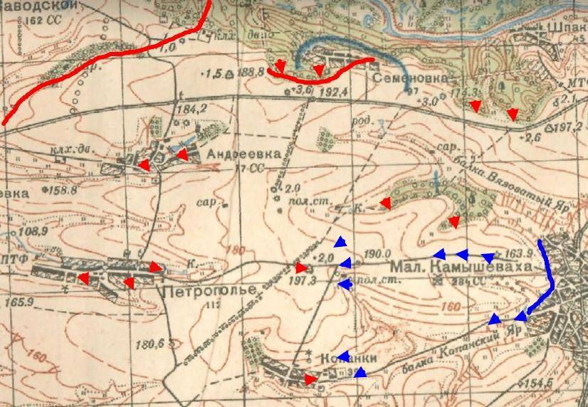 Никаких сведений о противнике кроме того, что он перешёл в наступление и прорвал оборону Южного фронта, захватив Барвенково, мы не получили. Поэтому, добравшись до реки Берека, пришлось действовать осторожно и выслать разведку в направлении Барвенково а так же Большой Андреевки. Командиру 23-й мотострелковой бригады я приказал переправиться через реку и занять рубеж обороны, оборудовав батальонные узлы сопротивления в населённых пунктах Грушеваха и Великая Камышеваха. Третий мотострелковый батальон, усиленный спецподразделениями бригады, должен был занять оборону от Великой Камышевахи до посёлка Заводской, расположенного на южном берегу Северского Донца. Шесть километров многовато для одного батальона, но с фронта его прикрывал глубокий овраг и речка Великая Камышеваха. Да и одной пассивной обороной я ограничиваться не собирался, а планировал перекрыть обе дороги, идущие с востока, вдоль южного берега Северского Донца, выдвинув в том направлении 130-ю танковую бригаду. Канонада от разрывов бомб и снарядов слышалась как на юге, так и на востоке от нас. Поэтому, где искать противника, можно было догадаться, не получая указаний от главнокомандования.