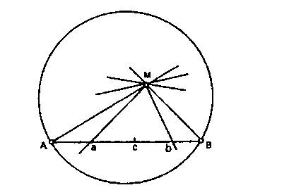 Но пожалуй, интерпретация Кэли – Клейна еще более простая [(рис. 8)] [83]. Представим себе шар. Точкой пусть будет точка только внутри этого шара, прямой—его хорда и плоскостью—любое круговое сечение шара. Все точки на поверхности шара исключаются. Тогда пересекающимися прямыми окажутся только те, которые имеют общую точку внутри шара. Если иметь в виду прямую А В и точку М, то пересекаться с А В будут все прямые, исходящие из Μ внутри угла AM В. Все же прямые за пределами этого угла не будут пересекаться с А В (вещественно, а будут пересекаться мнимо за пределами круга). Прямые МА и MB будут отделять все пересекающиеся прямые от не пересекающихся с прямой А В, т. 'е. они будут параллельными в смысле Лобачевского. Мы видим, что непересекающихся, расходящихся прямых в этих условиях может быть сколько угодно, что бесконечно удаленные точки никогда не могут быть достигнуты (так как они исключаются с самого начала), что прямые Μ А и MB образуют «равные» углы с «перпендикуляром» из Μ и А В и т. д. Тут выполняются все аксиомы геометрии, за исключением аксиомы об единственной параллельной.