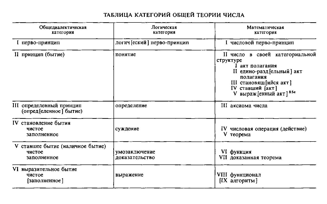Здесь мы имеем функцию от двух аргументов (л: и у), и она же, кроме того, является функцией производной от у {у'). И требуется узнать, какой вид надо придать функции (>>)>, чтобы интеграл имел максимум или минимум. Величина 3. Во–вторых, мы можем задаться вопросом: как выражается наполненное умозаключение, или доказанная теорема? Чистое ставшее раньше дало функцию, потом функционал. А что даст наполненное ставшее, если оно раньше дало доказанную теорему? В выражении есть внутреннее, есть внешнее и есть отношение между тем и другим. По внешнему, если это есть действительно выражение, мы должны узнать внутреннее. В предыдущем случае роль внутреннего лучше всего поручить функции, которая меняет свой вид; величина [J ] будет иметь значение (количественное) в зависимости от вида подынтегральной функции. Здесь же внутренним должна быть не функция, но доказанная теорема, т. е. прежде всего непосредственно данная значимость числа. Ее–то мы и должны найти по некоему внешнему виду выражения. Мы должны иметь такое выражение, чтобы путем разного рода манипуляций добраться до некоей непосредственной числовой значимости и чтобы этот процесс получения оказался вместе с тем и процессом доказательства. Это не есть просто доказательство, потому что тогда мы имели бы здесь ту или иную теорему. Но это есть доказательство наличия некоей определенной числовой значимости, построяемое всецело на внешнем ее выражении, на выражении ее внешних судеб. Внешние судьбы ее известны, а сама она—неизвестна; и вот, изучая это известное, мы идем к [не Известному, ибо это – выражение диалектический синтез известного внешнего и неизвестного внутреннего. Другими словами, тут перед нами уравнение в самом широком и общем значении этого слова, когда какая–нибудь функция неизвестного аргумента дана как известная, т. е. приравнена той или иной числовой значимости, и, из этого приравнения исходя, мы должны определить сам неизвестный аргумент х. Пожалуй, выводимая здесь категория даже шире «решаемого уравнения», почему, может быть, целесообразнее было бы говорить вообще об алгоритме как методе исчисления чего бы то ни было с целью нахождения того или другого неизвестного. Таким образом: функционал есть число, данное как выражение чистой ставшести числа, или число как выраженность чистого умозаключения; алгоритм (уравнение) есть число, данное как выражение наполненной ставшести числа, или число как выраженность наполненного умозаключения. § 78. Общность полученных категорий. Для удобства обзора всех категорий общей теории числа см. таблицу. Необходимо отметить, что, поскольку мы в данном месте нашего исследования занимаемся именно общей теорией числа, постольку все выводимые здесь категории оказываются весьма общими, максимально общими, какие только могут быть в математике. Ни одна математическая наука не может их избежать, как бы ни старались многие разверстать их между отдельными науками. Что чистые арифметические числа действуют решительно в каждой математической науке, напр. в анализе, это ясно. Так же ясна универсальность таких категорий, как действие или теорема. Но пожалуй, не всем ясно, что точно такой же универсальностью обладает и категория функции. А это действительно так. Прежде всего самые арифметические действия могут рассматриваться как некоторого особог