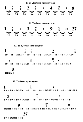 [Закрыть] Эти отношения царят в каждом промежутке, образованном по тем или иным законам. Отсюда делается понятным, почему Платон и Прокл вставляют в промежутки между диалектически выведенными числами 1,2, 3, 4, 8, 9, 27 отношения 3Л и 3/2· Это есть, как видим, повторение той же самой диалектики первой тетрактиды в каждом моменте ино–бытийной тетрактиды, что и не может быть иначе, если принять во внимание основной парадейгматический закон диалектики. Однако детализация идет и дальше. Взявши ряд– 1, 4/з, 3/2, 2, мы замечаем, что тем самым мы предположили еще новое отношение, а именно то, которое заключается между 4/3 и 3/2, т. е. 9/8. Это есть отношение целого тона. До сих пор это – наиболее близкое расстояние между двумя величинами. Если так, то попробуем расчленить и более широкие промежутки на этот наименьший интервал. Тогда получится, что кварта 4/3 содержит в себе два раза по 8/9 и одно отношение