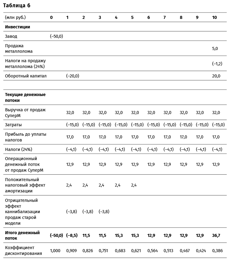 Выручка, понятно, является положительным денежным потоком (возможные товарные кредиты мы учитываем в оборотном капитале), поэтому, безусловно, ее нужно учесть в модели. Однако затем идет интересная категория затрат, которые часто упускают из вида при оценке инвестиционных проектов, – отрицательное влияние каннибализации продаж существующих продуктов. В нашем случае при выпуске на рынок новой модели продукта будут падать продажи уже имеющегося в этой же нише старого продукта. Новый продукт «скушает» часть доли рынка у старого. Надо понимать, что это самый что ни на есть настоящий инкрементальный отрицательный денежный поток нашего проекта. Это упущенные возможности (opportunity cost of capital). Часто при оценке инвестиционных проектов аналитики сосредотачиваются только на самом проекте, упуская из виду его последствия, находящиеся за пределами непосредственного «поля зрения». Про это нельзя забывать. Кроме того, нужно учитывать, что в примере указана цифра потерь прибыли до налогообложения. При расчете дополнительно сэкономленные налоги уменьшат отрицательный денежный поток. Иными словами, в примере «АБВ» отрицательный денежный поток от каннибализации продаж составит 5 – 5 × 24 % = 3,8 млн руб. в год в течение только тех трех лет, пока планировалось сохранять производство старого продукта.