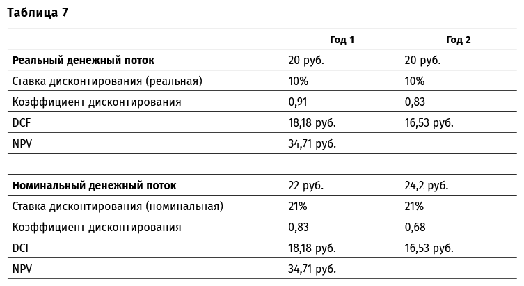 В данном случае реальный денежный поток первого года (20 руб.) будет продисконтирован по ставке в 10 %, а номинальный денежный поток первого года (22 руб.) будет продисконтирован по ставке 21 %. Обратите внимание, что дисконтированные значения каждого года в обоих методах равны (18,18 руб.). То же самое справедливо и для всех последующих лет. Таким образом, оба метода расчета дают в конечном итоге одно и то же значение NPV (табл. 7).