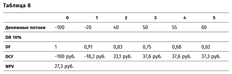 Давайте рассмотрим вычисление терминальной стоимости на примере. Итак, у нас есть проект с пятилетним сроком работы и некоторыми денежными потоками. Вычисление его NPV трудности не представляет (табл. 8).