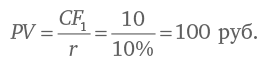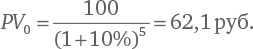 Обратите внимание на следующий момент: для формулы мы используем денежный поток «первого» года, а PV получаем на текущий момент или «нулевой» год. В данном случае «нулевым» годом для нас будет пятый, а «первым» – шестой год. Иными словами, полученное значение в 100 руб. – это терминальная стоимость на конец пятого года (в деньгах «пятого года»). Чтобы привести ее к общему знаменателю для расчета NPV, нам нужно продисконтировать 100 руб. к началу нулевого года (то есть к деньгам «сегодня»):