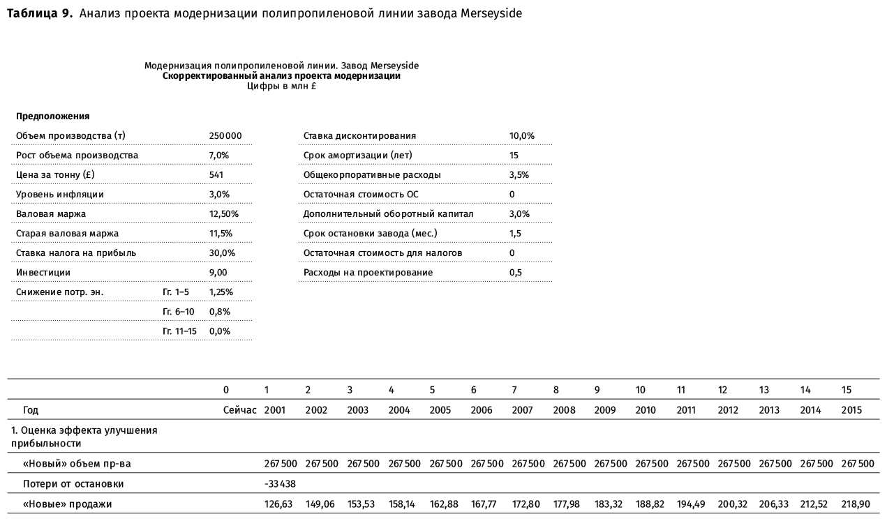 Кроме того, в свой анализ Такер включил £500 000 расходов на проектирование модернизации, которое выполнили инженеры-конструкторы завода в ходе подготовки анализа проекта. Согласно требованиям корпоративного центра Pearl Propylene, в расчет проекта были также включены дополнительные накладные расходы на корпоративный центр в размере 3,5 % от остаточной стоимости основных средств, принимаемых на баланс завода в результате проекта.