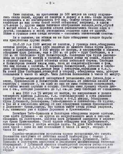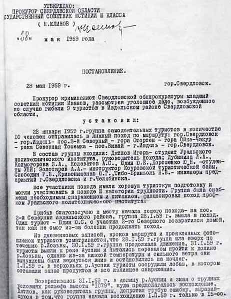 Феерический ответ на него последовал незамедлительно – закрыть дело! 28 мая 1959 г. родилось постановление о прекращении следствия. Всю существенную часть этого документа можно свести к нескольким строкам, которые приведём дословно: «Учитывая отсутствие на трупах наружных телесных повреждений и признаков борьбы, наличие всех ценностей группы, а также принимая во внимание заключение судебно-медицинской экспертизы о причинах смерти туристов, следует считать, что причиной гибели туристов явилась стихийная сила, преодолеть которую туристы были не в состоянии. (…) не усматривая в данном деле состава преступления, руководствуясь пунктом 5 и 4 УПК РСФСР, постановил: уголовное дело о гибели группы туристов дальнейшим производством прекратить.»
