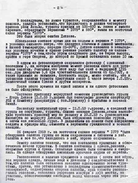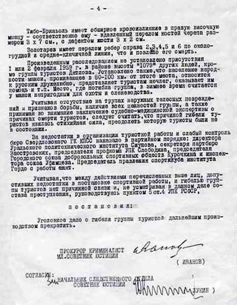 Фотокопии всех четырёх страниц постановления следователя Льва Иванова о прекращении «уголовного дела о гибели группы туристов». Фотографии кликабельны, так что текст желающие могут прочесть сами. В постановлении присутствуют любопытные моменты, на которые следует обратить внимание (некоторых из них мы уже касались, о других придётся говорить ниже). Так, например, уже в первом предложении устанавливающией части этого документа погибшая группа названа «самодеятельной», что не соответствовало действительности. Следователь Иванов грубо ошибся в определении времени установки палатки на склоне Холат-Сяхыл и погоды, при которой это происходило. В постановлении ни словом не упоминается ни радиологическая экспертиза, ни соответственно, радиоактивные вещи непонятного происхождения. Никак не раскрыта природа «стихийной силы», которая, якобы, погубила группу. Утверждение же об «отсутствии на трупах наружных телесных повреждений» противоречит не только истине, но и документам того самого дела, которое венчает сей эпический труд. Документ явно предназначен для ознакомления с ним родственников погибших и составлен, безусловно, очень ловко, чего только стоит фраза о необнаружении «следов присутствия других людей». Она тем более замечательна, что следствие не обнаружило многих следов самих «дятловцев», которые должны были существовать обязательно – например, следов поднимавшихся в гору Зины Колмогоровой и Игоря Дятлова. Однако никакой неловкости от собственной нелогичности автор постановления не испытал. Замечательный образчик юридической одарённости следователя Льва Иванова.