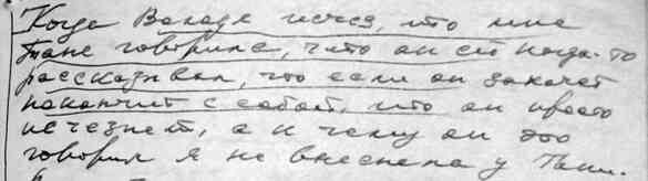 Разумеется, следователь задал вопросы о половой сфере – эту тему никак нельзя было обойти молчанием. Татьяна ответила следующим образом: «В половом отношении Володя был нормально развит, никаких недостатков в этом отношении у него не было. В интимном отношении мы были с ним тактичны и открыты. Я сделала три аборта от жизни с Володей. Когда я первый раз забеременела, то объяснила Володе, что нужно как-то решить наши отношения. Володя всё говорил, что ещё нужно подождать и предложил аборт сделать. Я не могла заставлять его жениться, а воспитывать ребёнка [в одиночку – прим. А.Р.] я была не в силах. Последний аборт я делала от него примерно три года тому [назад]. Я его очень любила, поэтому не остерегалась от того, чтобы не беременеть.»