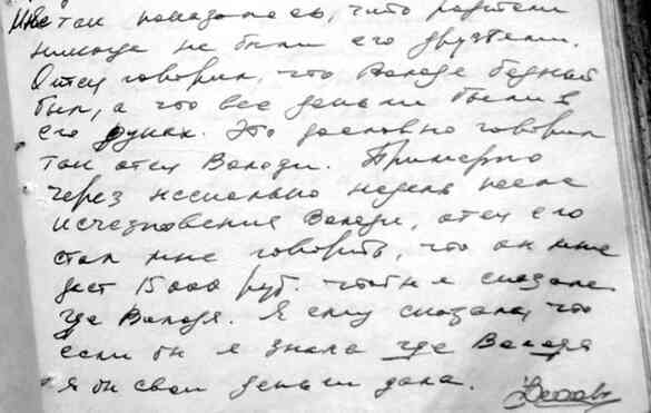 Но дальше становится только интереснее. Допрос опять сместился в сторону обсуждения отношения родителей композитора к его продолжительной связи с Татьяной Жуковой и тут Светлана выдала неожиданное: «Мне так показалось, что родители никогда не были его друзьями. Отец говорил, что Володя бедный был, а что все [заработанные им] деньги были в его руках [т.е. руках Михаила Григорьевича Ивасюка – прим. А.Р.]. Это дословно говорил так отец Володи. Примерно через несколько недель после исчезновения Володи отец его стал мне говорить, что он мне даст 15 000 руб., чтобы я сказала, где Володя. Я ему сказала, что если бы знала, где Володя, я бы свои деньги дала. Отец дал мне понять, что он сможет мне повредить по работе. Родители Володи очень тяжёлые в характере и я убеждена, что Володя мучился с ними, однако, он это скрывал».