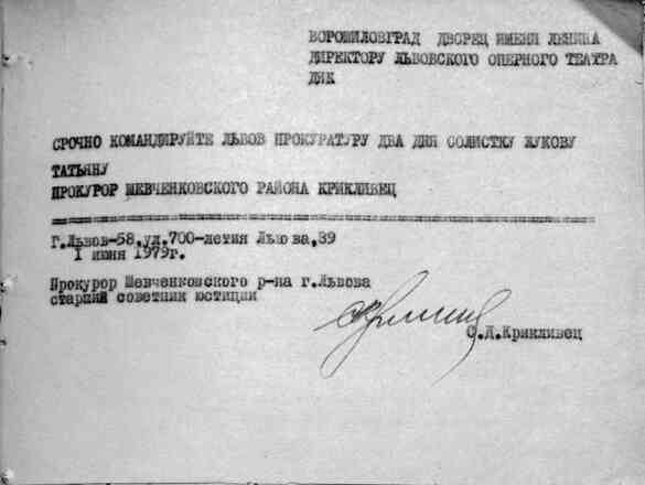 Телеграмма райпрокурора Крикливца директору Львовского оперного театра, труппа которого находилась в Ворошиловграде на гастролях, с требованием отправить Жукову во Львов на двое суток.