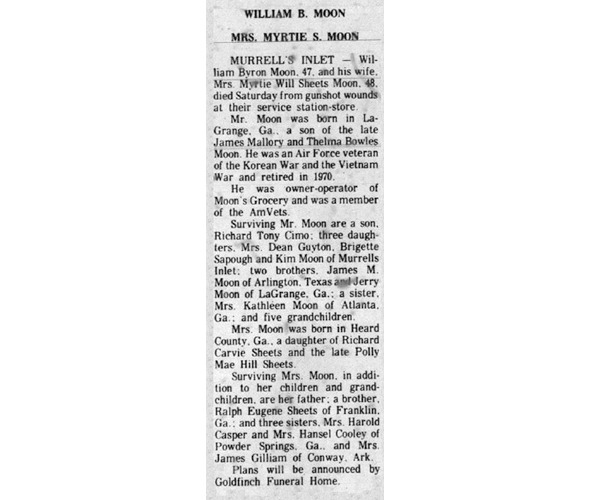 Краткая заметка в местной газете, сообщавшая об убийстве Уилльяма и Мирти Мун, опубликованная на следующий день после преступления.