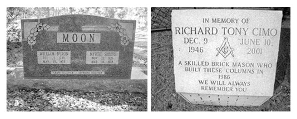 Слева: могильный камень на месте захоронения Уилльяма и Мирти Мун. Справа: памятник Тони Симо у самой кладбищенской ограды.
